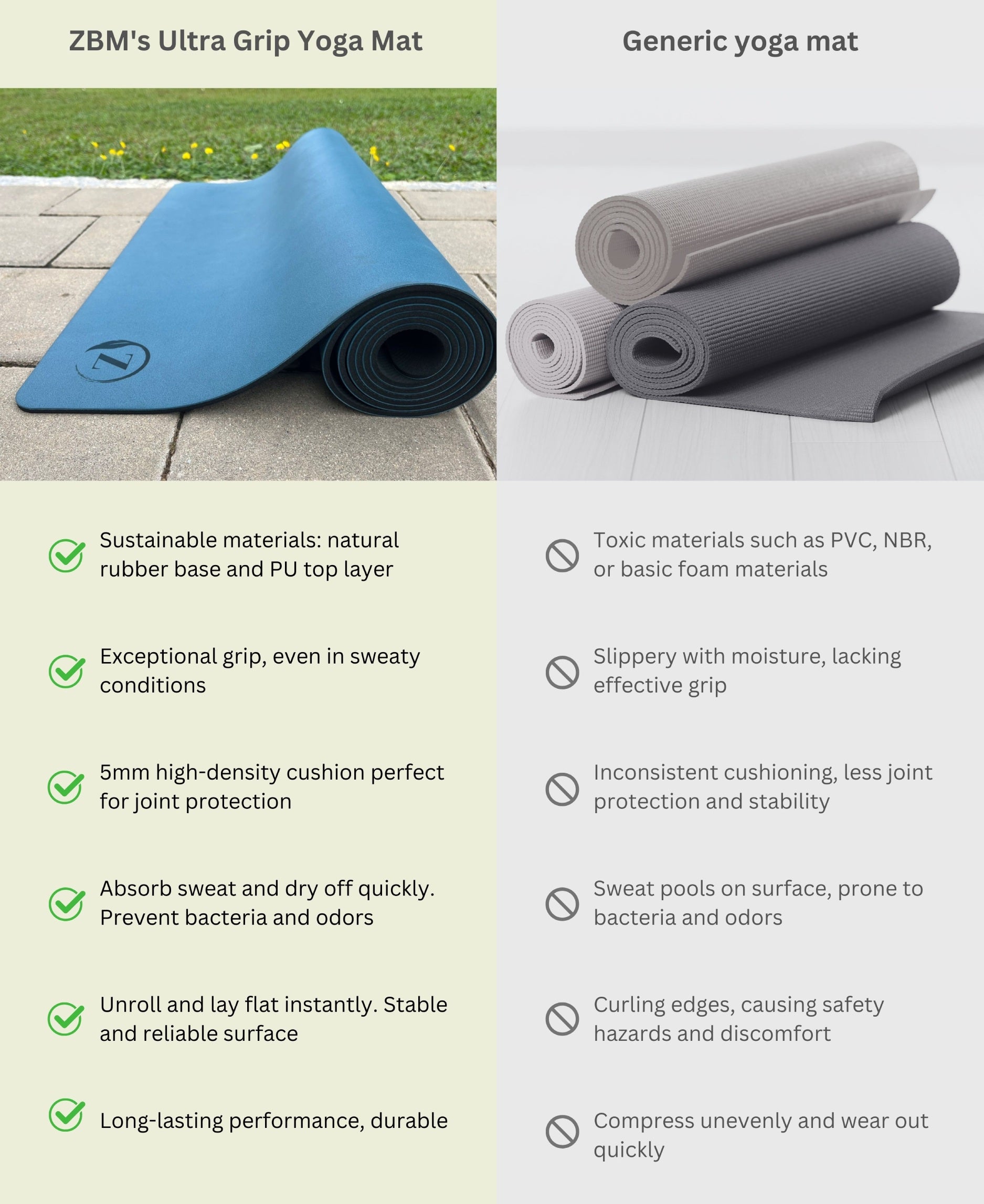 Experience the perfect balance of style, performance & sustainability with our Ultra Grip Yoga Mat - crafted from smooth matte PU top layer and sustainable rubber base. It offers exceptional grip, stability, and comfortable cushioning. The minimalist, elegant matte finish, paired with its oversized design bring comfort and peace of mind as you move, allowing full immersion in your practice. Non-toxic and PVC-free. Invest in your wellness today with this premium mat that elevates your practice with renewed motivation.